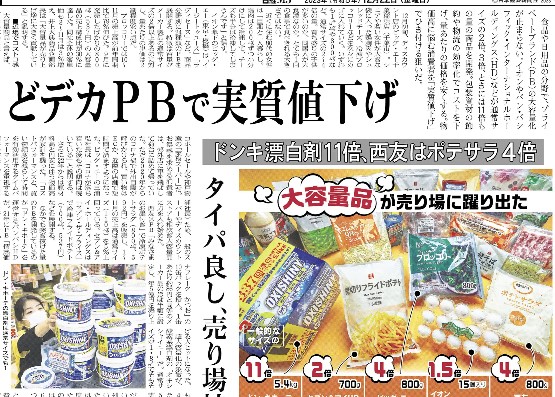 【22日のMJ】食品や日用品の分野で、プライベートブランド(PB)の大容量化が止まりません。イオンやパン・パシフィック・インターナショナルホールディングスなどが通常サイズの2倍、3倍、ときには11倍もの量の商品を開発。物価高に悩む消費者を「実質値下げ」でひき付ける狙いです。