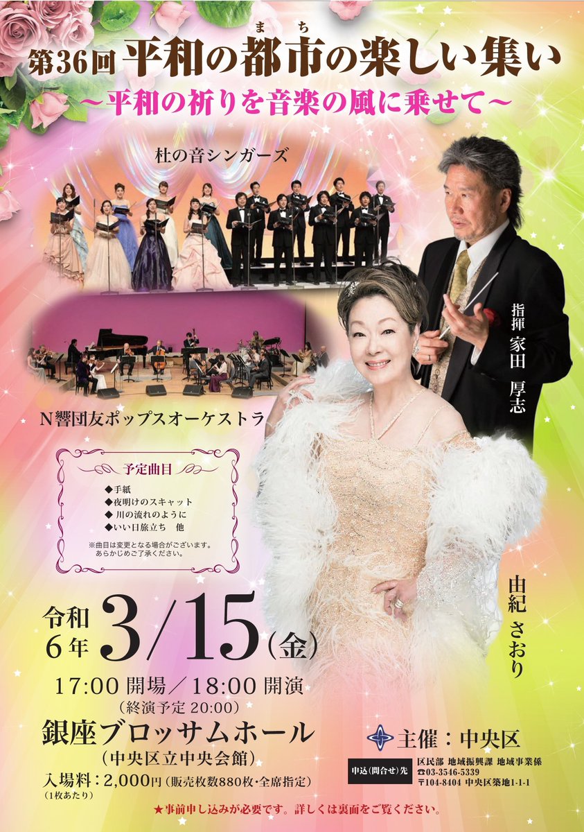 「平和の都市(まち)の楽しい集い」は音楽を通じて平和の大切さを改めて考える行事です。今回は、由紀さおりさん、指揮 家田厚志さん、杜の音シンガーズ、N響団友ポップスオーケストラをお迎えしてご演奏いただきます。