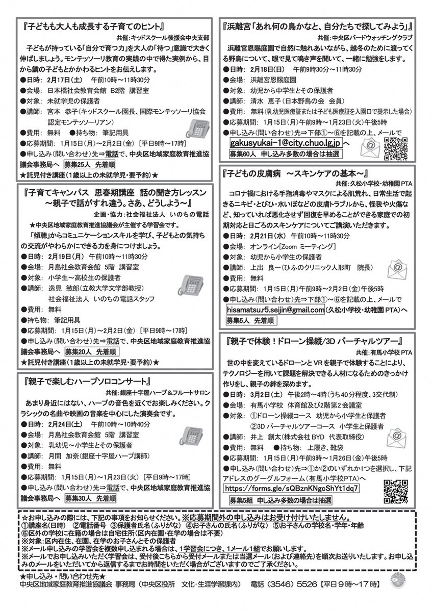 1月以降も「子育てキャンパス」や「子どもの皮膚病~スキンケアの基本~」など、14の学習会を予定しています。