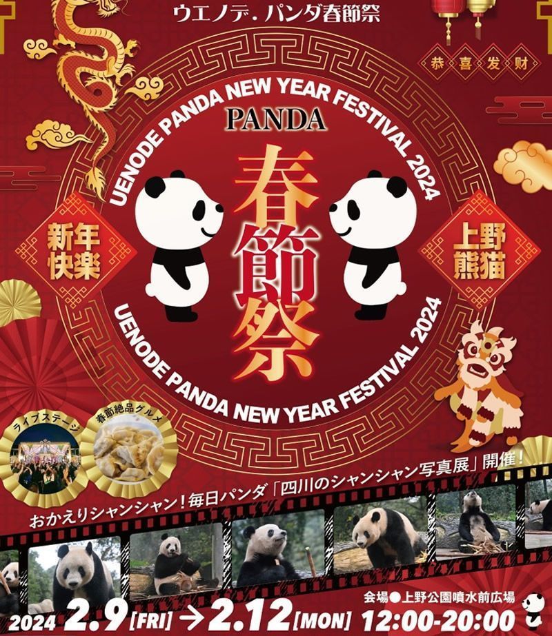 2/9(金)-12(月祝)東京・上野公園で「ウエノデ.パンダ春節祭」開催。中国各地の料理が集まるグルメイベント。シャンシャンの写真展も同時開催。入場無料→event-checker.info/syunsetsu..