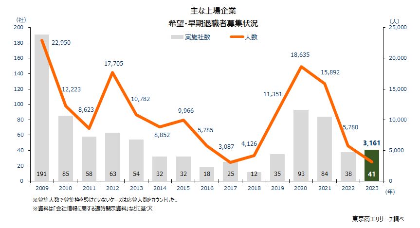 2023年の「早期・希望退職者募集」は41社 人手不足のなか3年ぶり増加、黒字企業が半数を超える www.tsr-net.co.jp/data/detai.. #早期退職者 #希望退職者 #東京商工リサーチ
