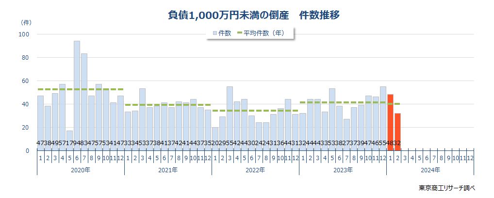 2月の「負債1,000万円未満の倒産」は32件 10カ月ぶりに前年同月を下回る www.tsr-net.co.jp/data/detai.. #負債1000万円未満倒産 #企業倒産 #東京商工リサーチ