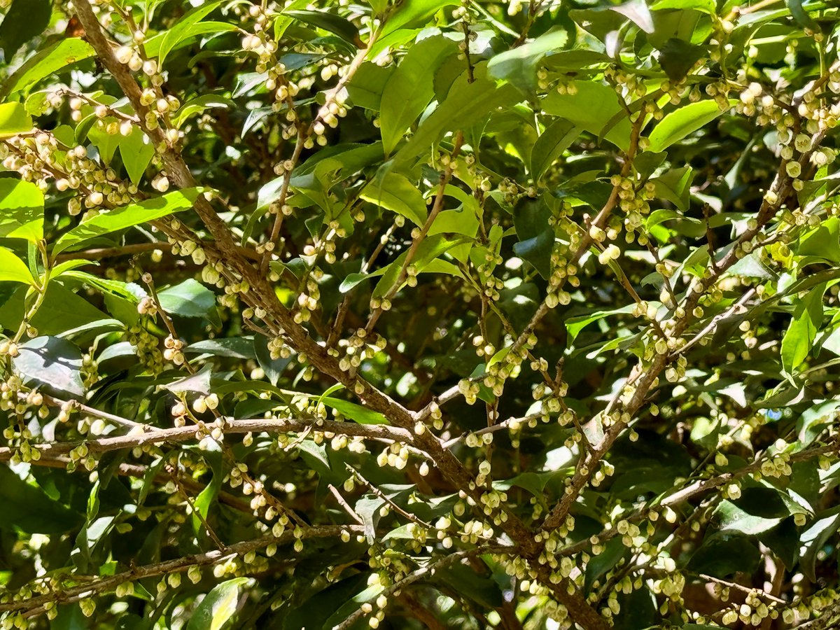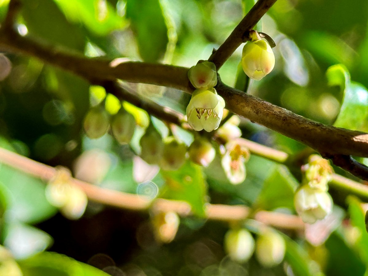 Introducing East Asian eurya, a plant characterized by tiny pendulous, bell-shaped, cream-colored flowers that bloom densely on the trees in the spring.