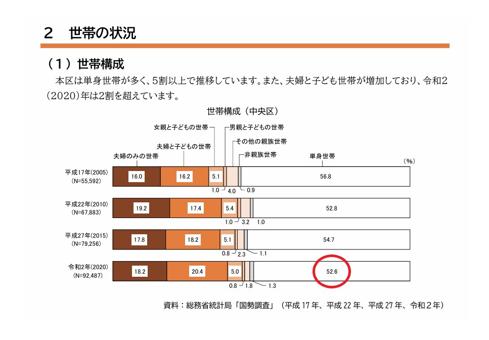 令和6年3月「中央区保健医療福祉計画2020」の見直し。改正社会福祉法により創設された重層的支援体制整備事業を包含。令和9年度中に20万人都市となり、月島地域は10万人超え。世帯人員は京橋1.60人、日本橋1.64人、月島1.95人で、単身世帯が5割以上。社会的孤立や孤独が課題。