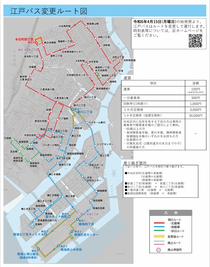 4月15日の始発便より、コミュニティバス「江戸バス」の運行ルートを変更。江戸バス南循環は晴海フラッグ(晴海5丁目)を走り、晴海地区の交通利便性の向上を。また、二酸化炭素を排出せずに走行できる環境にやさしいEVバスを導入。ゼロカーボンシティ実現に向けた取組みを。