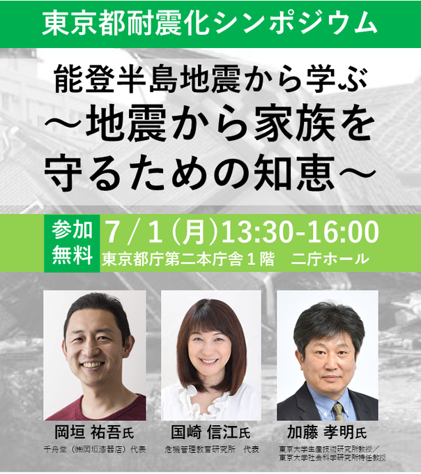 【まもなく定員!!】 #能登半島地震 から半年をむかえる7月1日(月)に東京都耐震化シンポジウムを開催します。 「地震から家族を守るために今からできる防災対策」などが学べます。 講師は、防災専門家(#国崎信江 氏)、加藤孝明教授、輪島塗経営者など。 詳細・申込は →https://taishin.metro.tokyo.lg.jp/tokyo/event_20241.html#top_main…