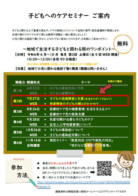 令和6年度 第2回「子どもへのケアセミナー」は、7月27日(土)10時30分から12時まで「子どもの発達障害と支援(生活をサポートするコツ)」「発達障害の子どもの親とのかかわり」 について認定看護師がわかりやすく解説します.みなさまご参加ください. #子どもへのケアセミナー
