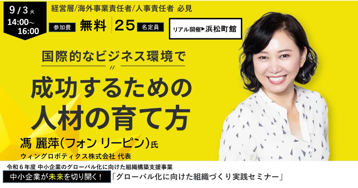 R6年度 グローバル化に向けた組織づくり実践セミナー 9月3日(火)14時/無料 東京都立産業貿易センター浜松町館5階(港区) #経営層/#海外事業責任者/人事責任者 必見! #国際的 なビジネス環境で成功するための人材の育て方を分かり易く解説 詳しくは https://global-seminar-tokyo-kosha.jp #人材を人財に