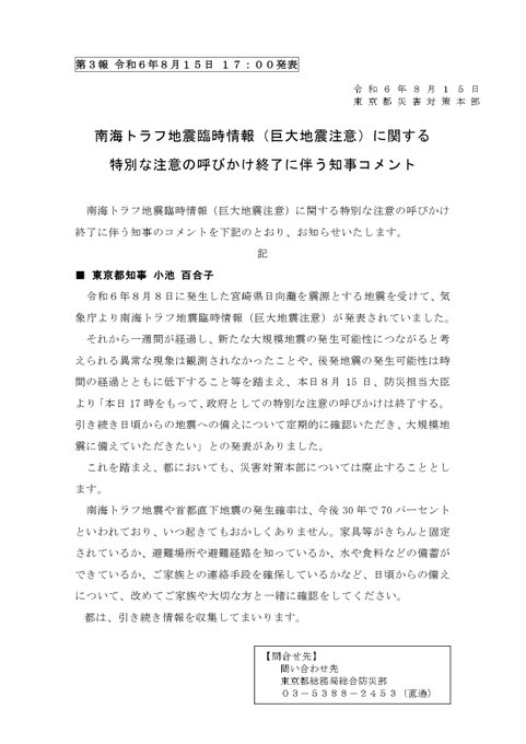 南海トラフ地震臨時情報(巨大地震注意)について、本日8月15日、防災担当大臣より「政府としての特別な注意の呼びかけは終了する」との発表がありました。 この発表を踏まえ、知事から都民の皆様に対して、次のコメントを発表しました。 知事コメント全文はこちら https://bousai.metro.tokyo.lg.jp/taisaku/saigai/1030044/1030071.html…
