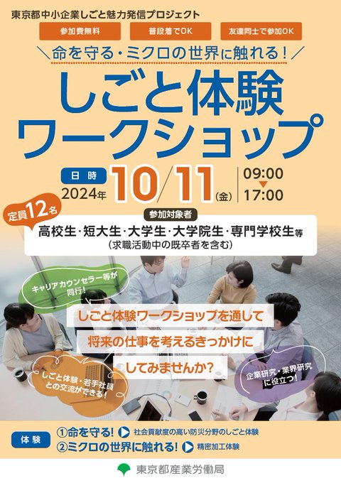 / 就活に役立つ 「しごと体験ワークショップ」申込受付開始 \ キャリアカウンセラー等と企業を訪問し、しごと体験&社員交流! 日時:2024年10月11日(金)09:00~17:00 体験内容:防災分野のしごと体験/精密加工体験 詳細は↓ https://ws.formzu.net/fgen/S3896723/ ※参加費無料 #就活 #25卒 #26卒 #27卒