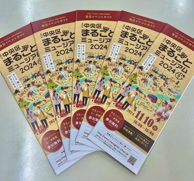 今年もまるごとミュージアム2024を開催します! 実施日時 令和6年11月10日(日) 午前10時~午後4時 まるごとミュージアムの当日イベントガイドのパンフレットを区施設などで配布中です! 皆さんぜひお手に取ってご確認ください #中央区まるごとミュージアム2024