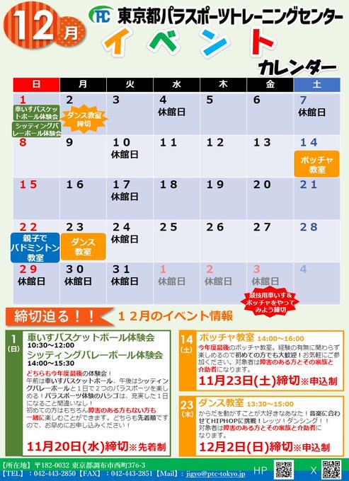 12月 #イベント 情報 1日:#車いすバスケットボール 体験会 #シッティングバレーボール 体験会 #パラスポーツ をハシゴしよう! どちらも今年度最後 23日:#ダンス 教室 今年度初開催 音楽に合わせてレッツダンシング ※障害のある方が対象です。 詳細→https://tokyo-ptc.jp/news/