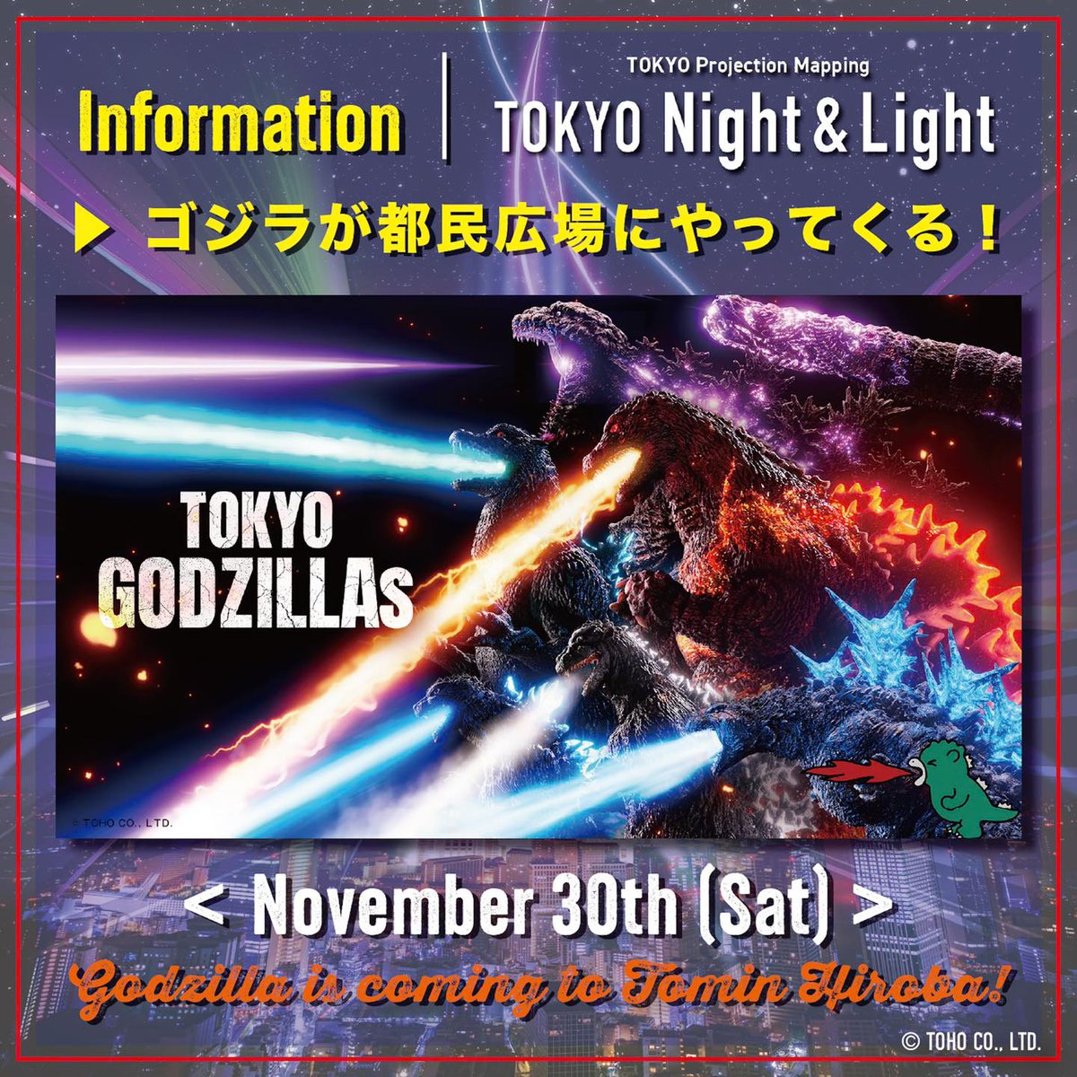 11月30日(土)より「TOKYO GODZILLAs」の上映がスタート! 上映初日は特別に初代ゴジラが都民広場に登場します! ぜひ公開当日に初代ゴジラと「TOKYO Night & Light」をお楽しみください! 初代ゴジラは、17:20頃、17:45頃、18:45頃の計3回登場予定です。 https://tokyoprojectionmappingproject.jp/event/20240225#godzillas…