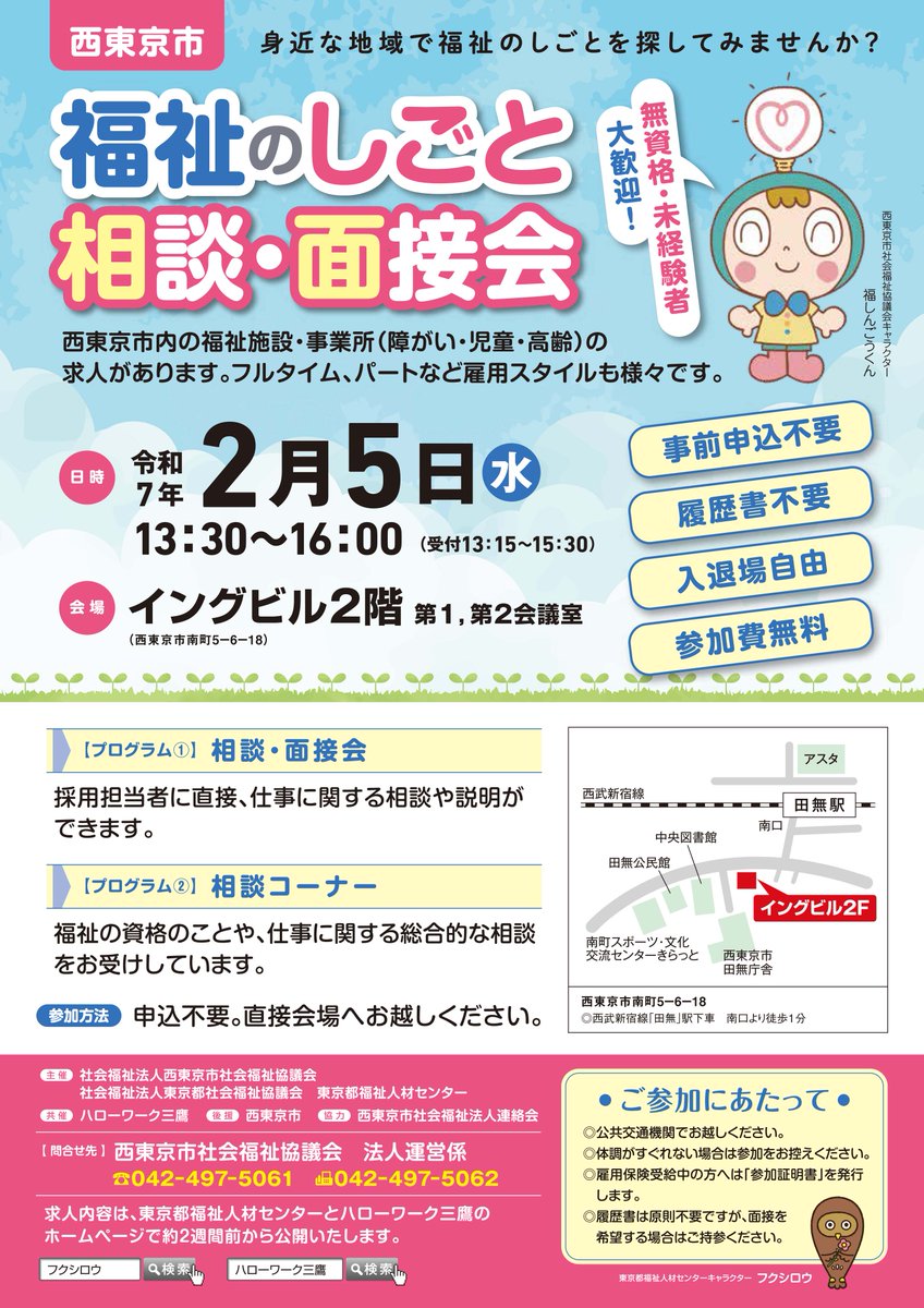 #ふくむすび 【人材センター】西東京市 福祉のしごと相談・面接会 西東京市内の17法人が参加予定です。西東京市内で仕事をお探しの方は、採用担当者と直接お話や相談、面接ができるチャンスです! ▼開催日 令和7年2月5日(水) 事前申込不要 イベント情報詳細はこちら↴↴ https://fukushijinzai.metro.tokyo.lg.jp/event/000741.html…