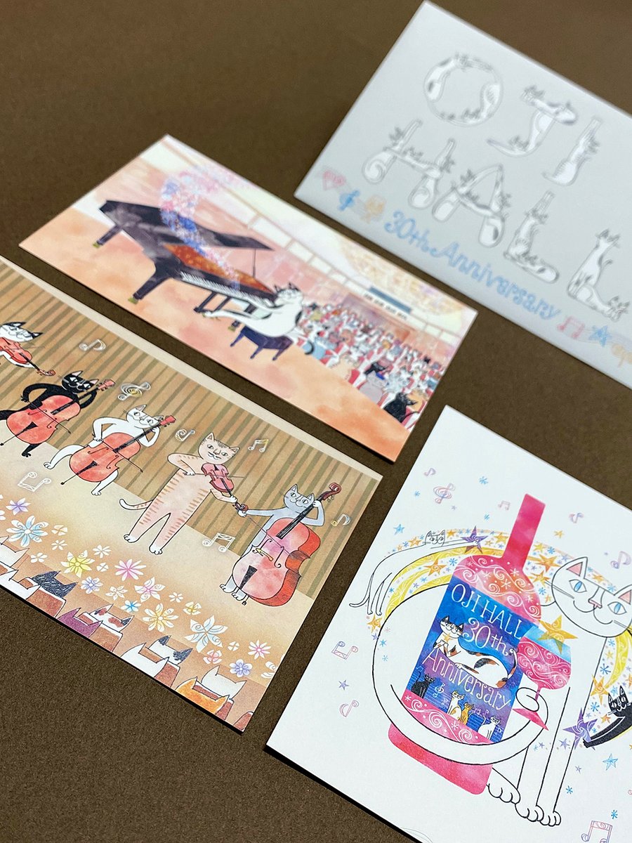 【30周年記念ポストカード】おかべてつろうさん×王子ホールのコラボ作品3枚セットを、2Fノベルティカウンターにて税込500円で販売中!口髭を生やし、ヴァイオリンを奏でる猫のモデルは…明後日登場する篠崎..