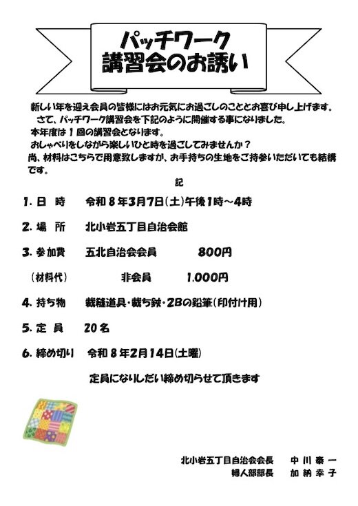 パッチワーク講習会のお誘い(令和8年3月7日)