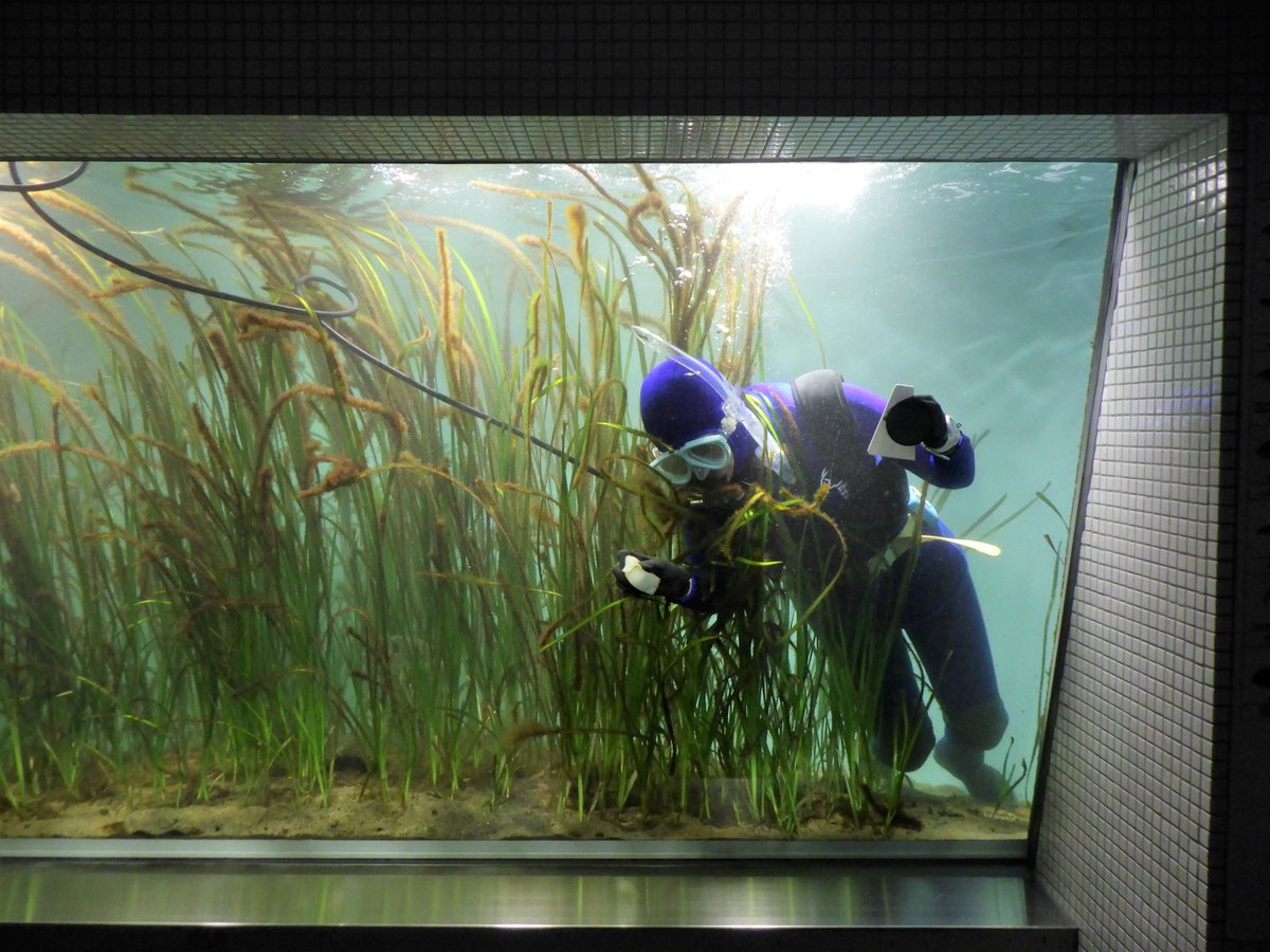 こちらは水槽に潜ったスタッフが、アクリルについたコケを掃除中🤿