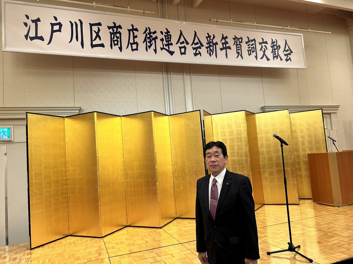 江戸川区商店街連合会の新年賀詞交歓会にお招きを頂き出席しました。区商連は区民の皆さまの生活を支え、誰もが安心して暮らせるまちを目指しています。3年ぶりの開催誠におめでとうございます。