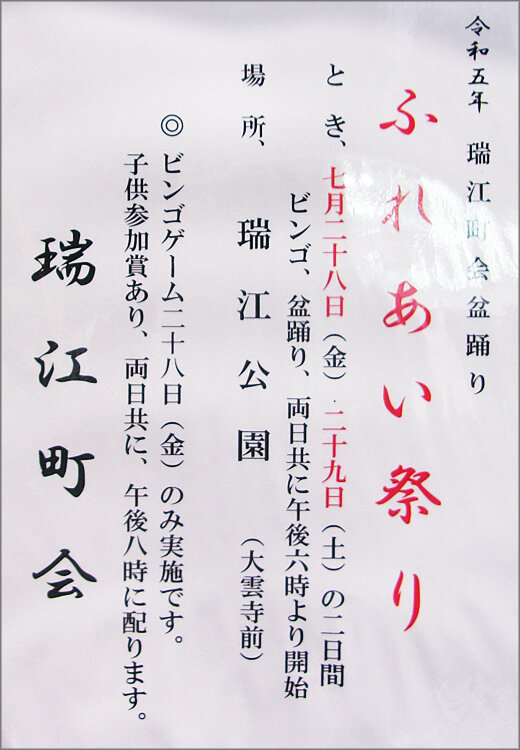 ふれあい祭り 日時:令和5年7月28日(金)・29日(土)ビンゴ、盆踊り、両日共に午後6時より開始 場所:瑞江公園(大雲寺前) ビンゴゲーム 28日(金)のみ実施です。