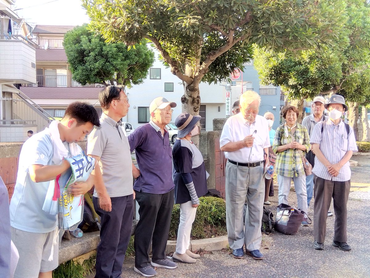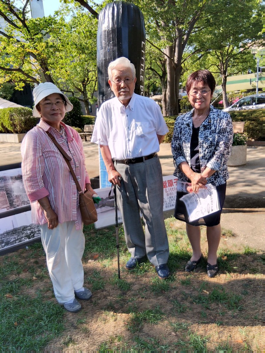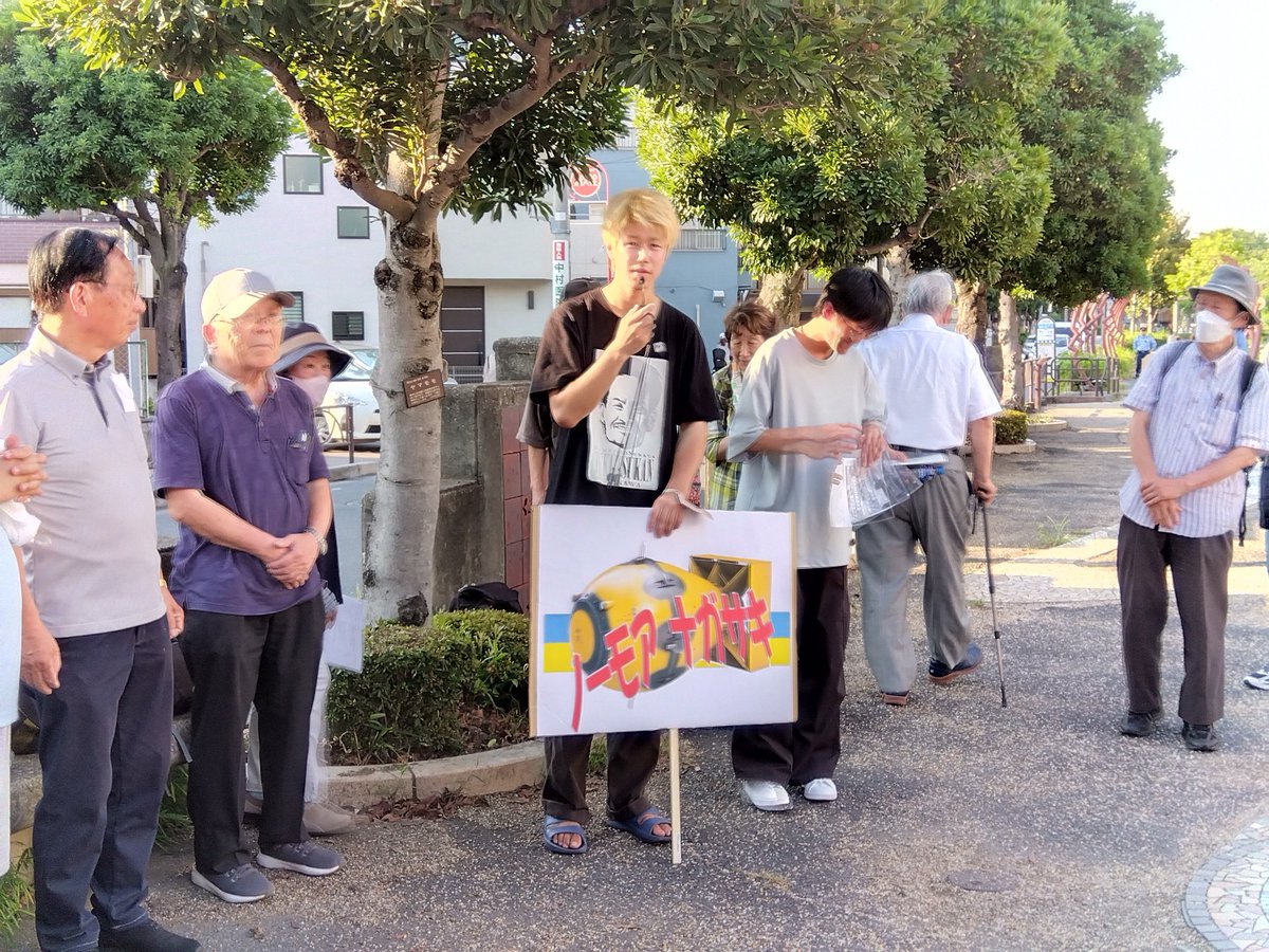 猛暑の中、江戸川原水協の丸さんは「核兵器禁止条約に参加を求め頑張りましょう。又、体調を優先して行進は無理しないで」と。それでも、50人を超える区民が文化センター前から横断幕を葛飾区へバトンタッチ。シュプレヒコールや歌いながら行進。韓国から大学生も参加