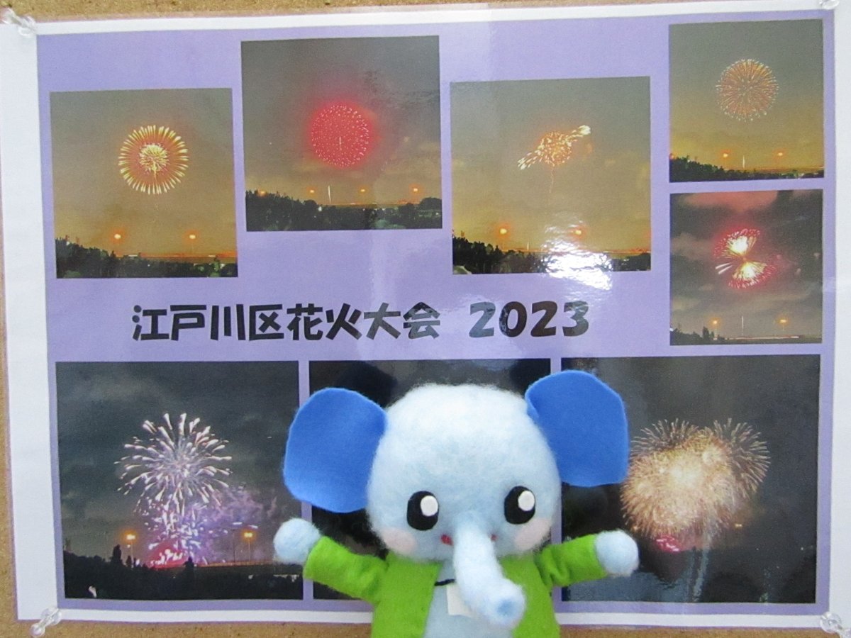階段踊り場に、先日おこなわれた「江戸川区花火大会」の花火たちの写真を