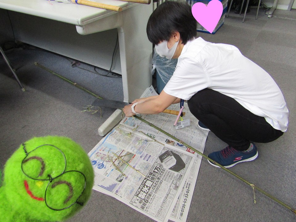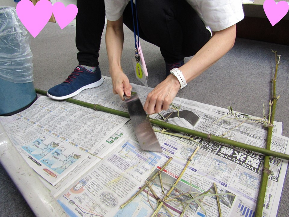 七夕で使用した笹をノコギリで切ってくれているんだよぉ~✨花壇の植物たちの支柱にするんだってぇ~!指切らないでね😊いつもありがとう❤
