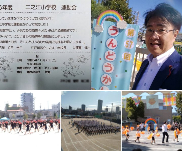 秋晴れのもと二之江小学校と船堀幼稚園の運動会が開催され、お招き賜りお訪ねしました。二之江小学校は校舎建替えのため、葛西小学校で開催。子ども達の元気な姿に、私も元気を頂きました!