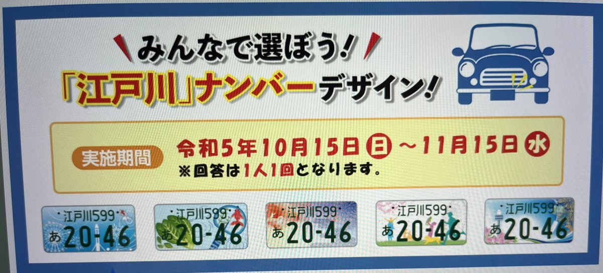 「江戸川」ナンバー図柄デザインに関するアンケート❗️ 私は 役所の投票箱に投函しましたが😊 江戸川区HPから回答フォームも有りますので、1人でも多くの区民のご意見から決めたいですね。 回答よろしくお願い致します #江戸川区 #ナンバープレート