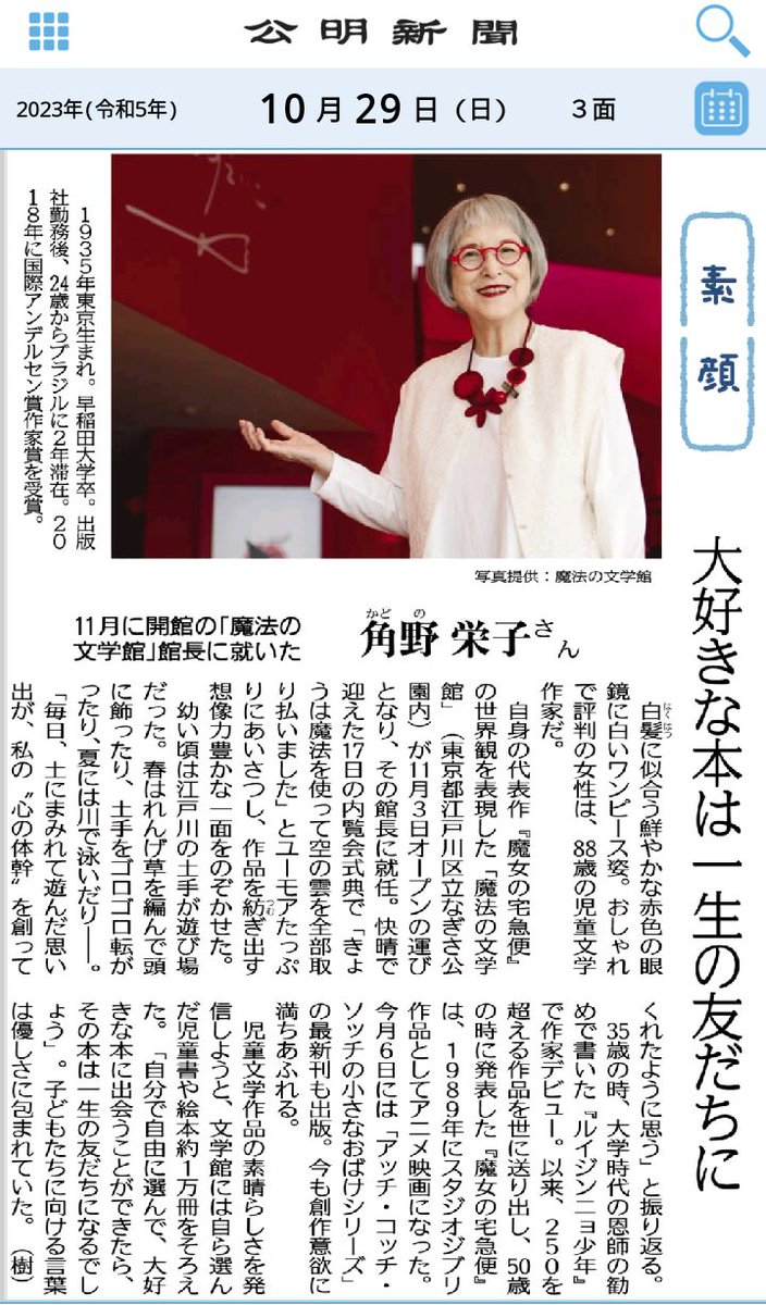 11月3日のオープンを前に『江戸川区角野栄子児童文学館』の記事が本日の公明新聞に掲載❗ (素顔)大好きな本は一生の友だちに/11月に開館の「魔法の文学館」館長に就いた 角野栄子さん #公明新聞電子版 2023年10月29日付 #江戸川区 #魔法の文学館 #角野栄子