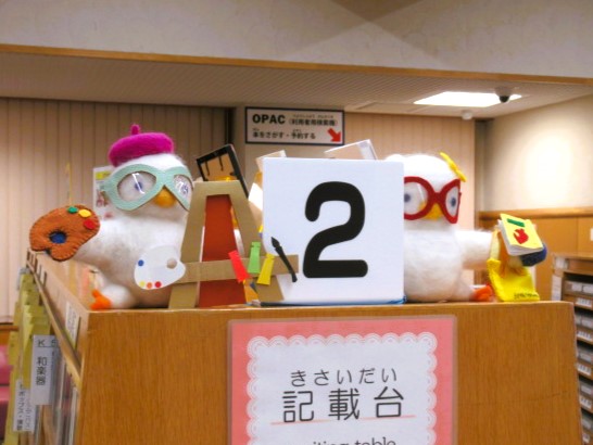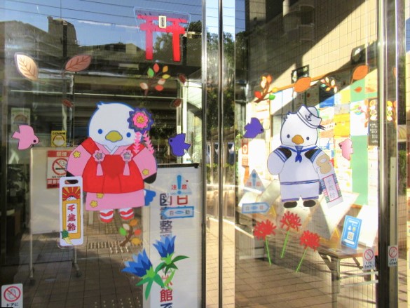 肌寒い日が続き、冬の気配を感じるようになりました。 11月の玄関では、七五三に因んで千歳飴を持った二人がお出迎え。 館内では、芸術と読書の秋を楽しむ様子の中に、角野栄子さんと同じく赤い眼鏡をしたかもめんが…! 是非、見つけてみてくださいね♪ #西葛西図書館