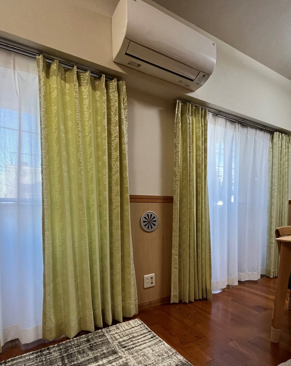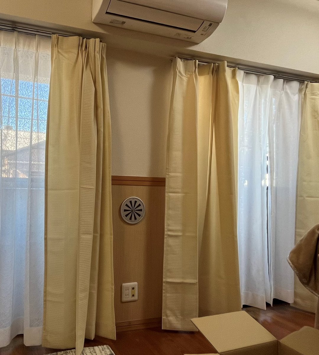 仮カーテンは既製品なのでサイズも窓にぴったりでは無く、近いサイズになります。オーダーカーテンが出来上がるまで少し我慢して頂きます