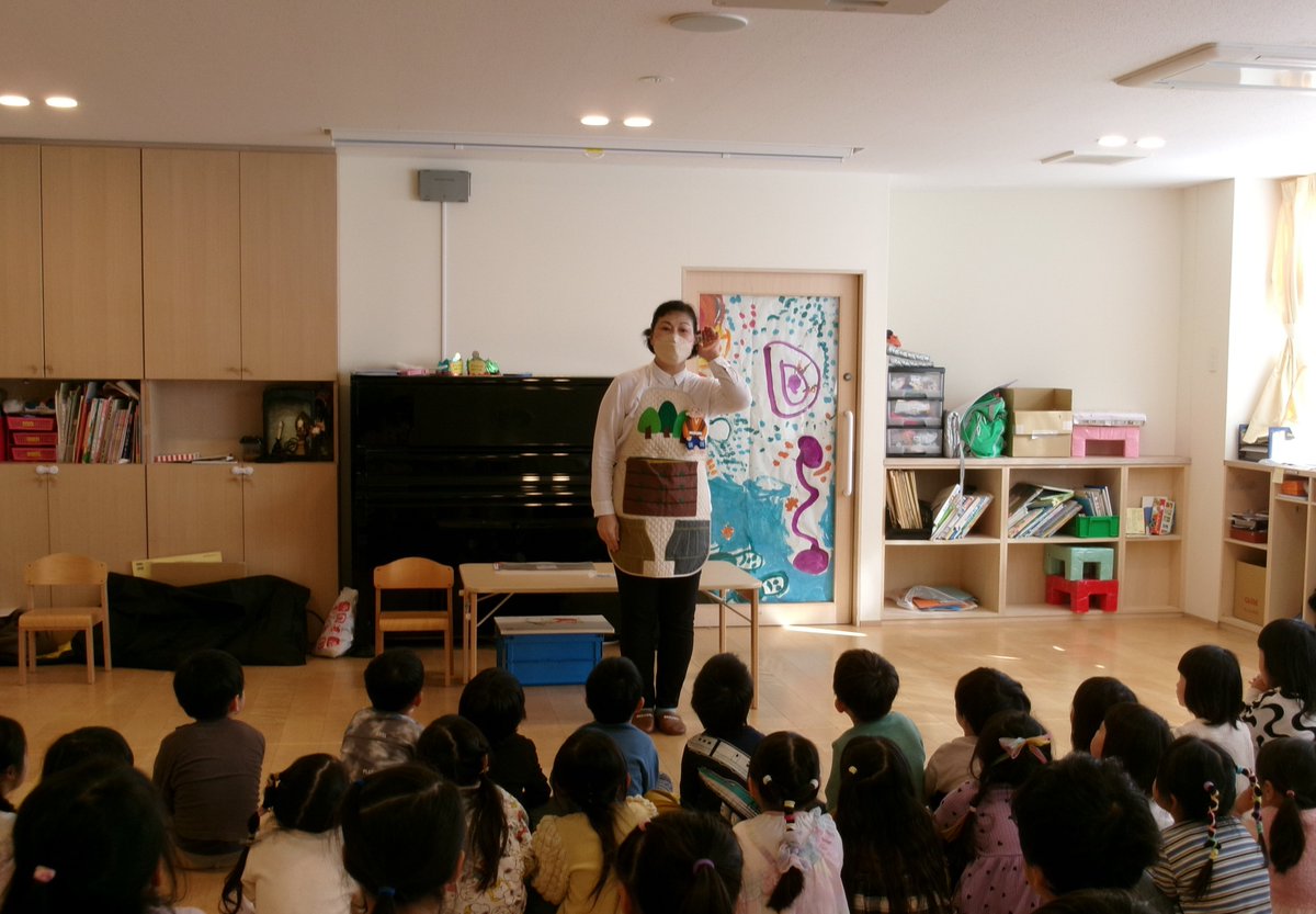今回は4・5歳児クラスさん。秋の食べものが出てくる絵本や紙芝居、エプロンシアターや手あそびなどで楽しみましたよ🍂みんな手拍子をしたり、歌や手遊びにも元気に参加してくれました♥