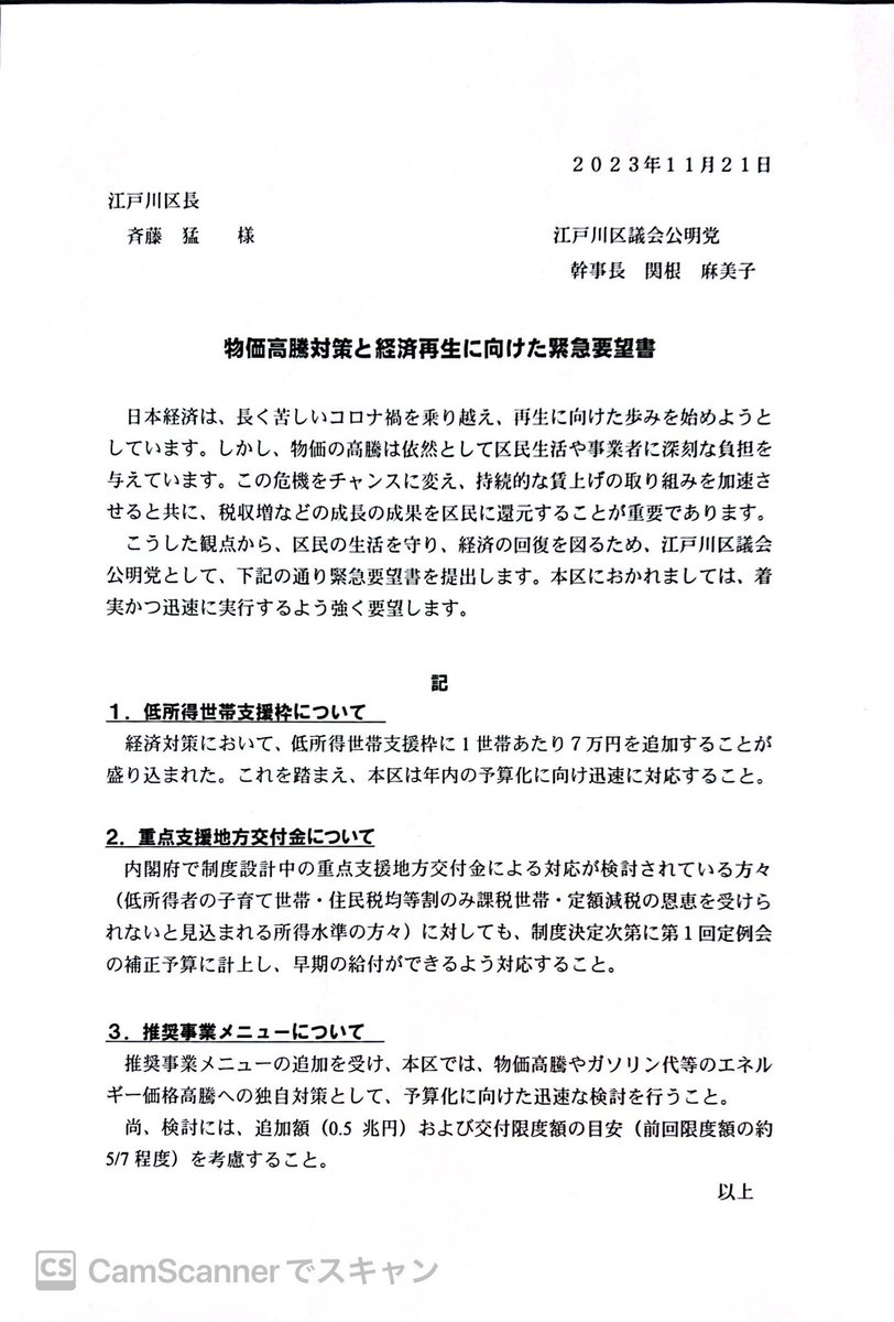 江戸川区議会公明党は、『物価高騰対策と経済再生に向けた緊急要望書』を斉藤区長に提出。