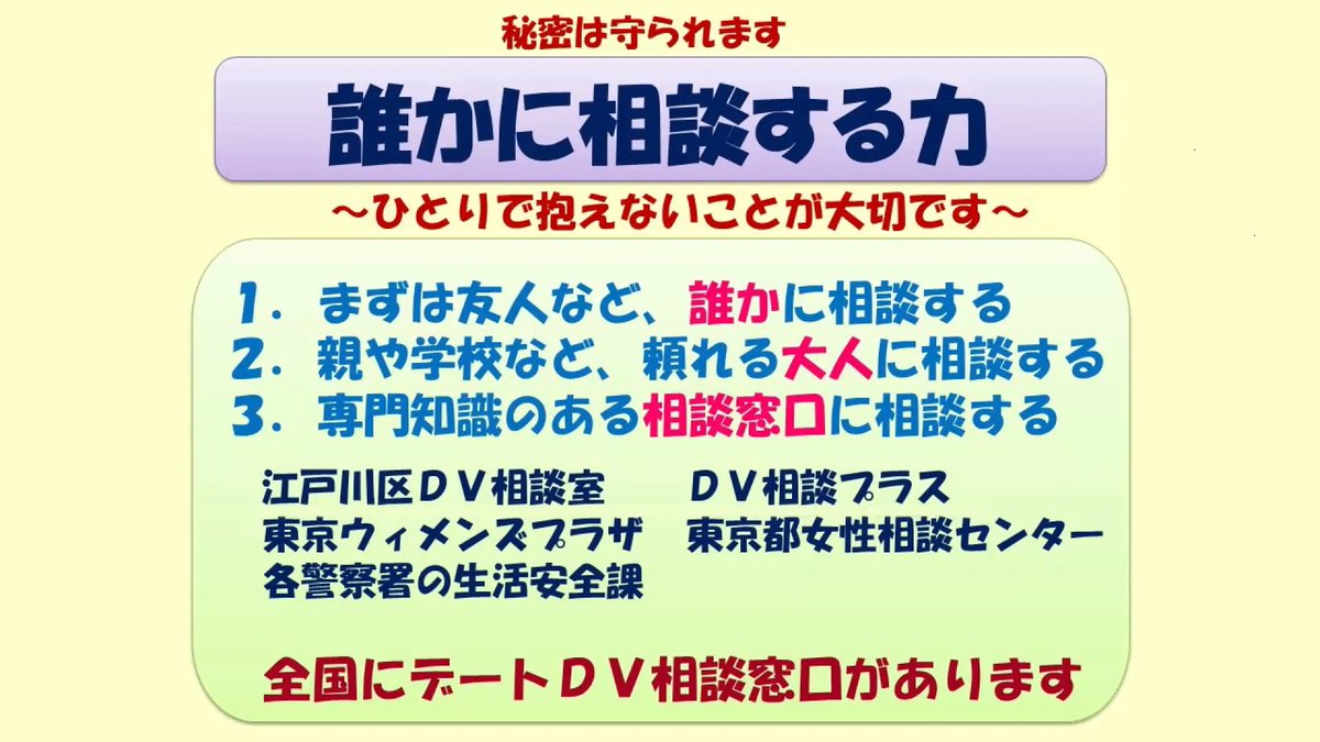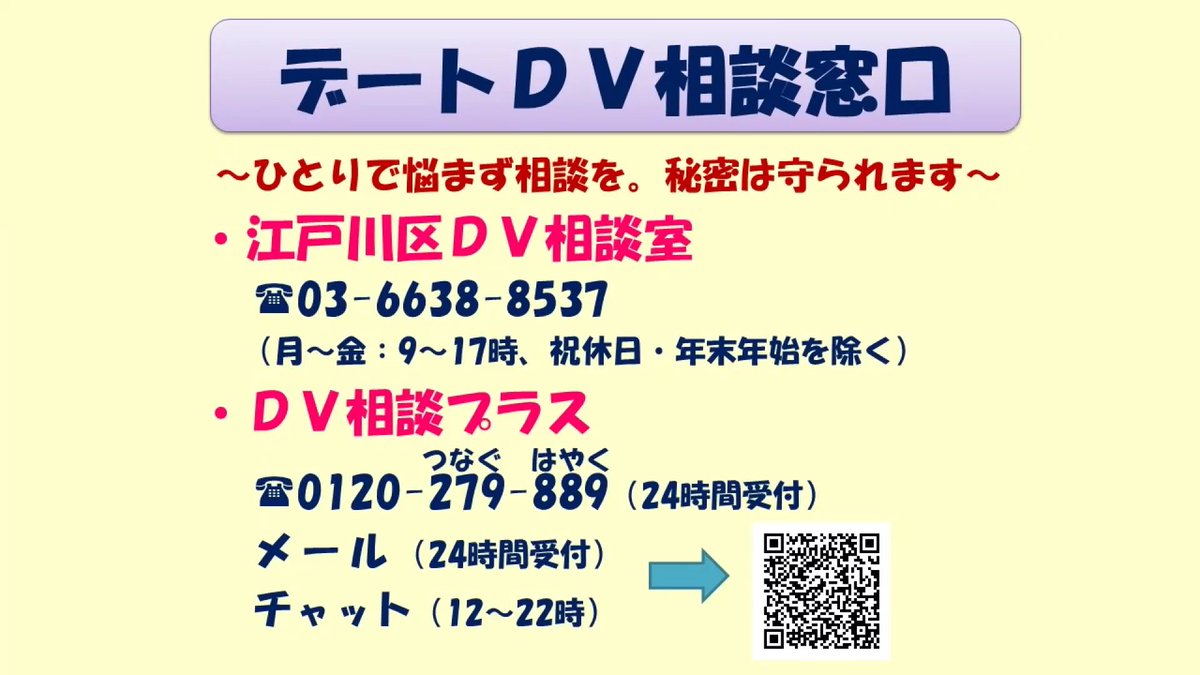 また、デートDVについての相談を受けた時は、一人で抱え込まず、以下の窓口に相談したり、友人に教えてあげたりしてください。
