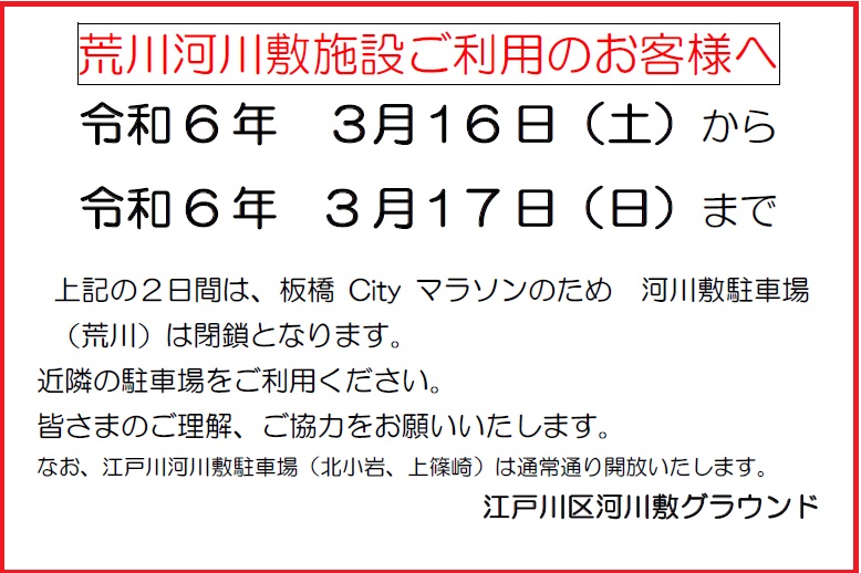 板橋Cityマラソン開催にともない上記の2日間は、河川敷駐車場(荒川)は閉鎖となります。