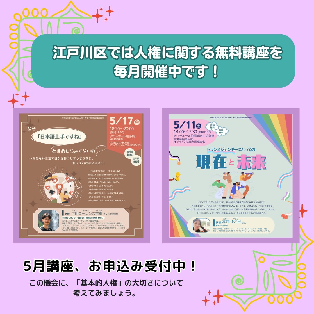 5/3の憲法記念日を含む5/1~5/7は、憲法週間です。 この機会に「基本的人権の尊重」の大切さについて考えてみませんか? 江戸川区では、毎月人権・男女共同参画に関する無料講座を開催しています。 #人権 #憲法 #GW