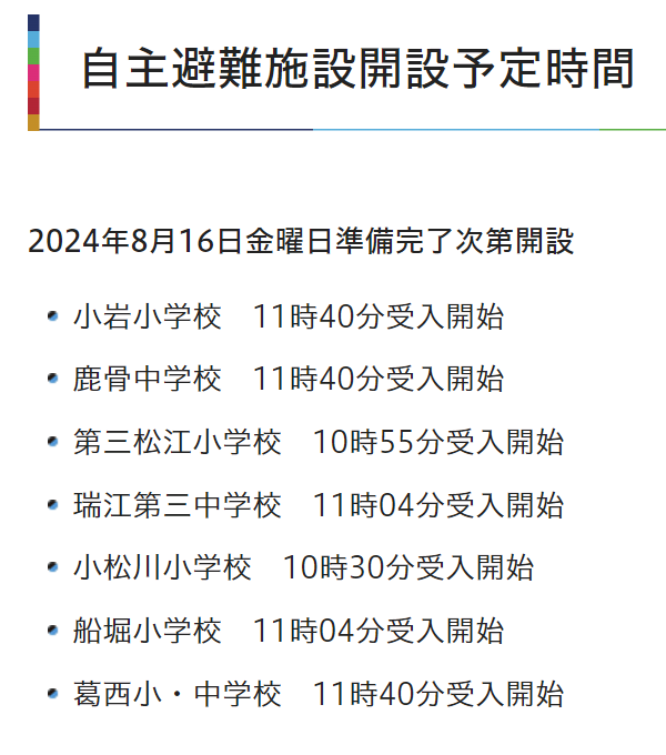 自主避難施設が開設されました。 リンク先で詳しい情報も更新されますので、ご確認ください。 https://city.edogawa.tokyo.jp/bosaianzen/saigaitaio/2024_typhoon7/index.html… 葛西地区は時々雨がざーっと降りますが、まだ小康状態に思えます。これから雨風強くなるようです。皆様もご安全にお過ごしください。 #江戸川区