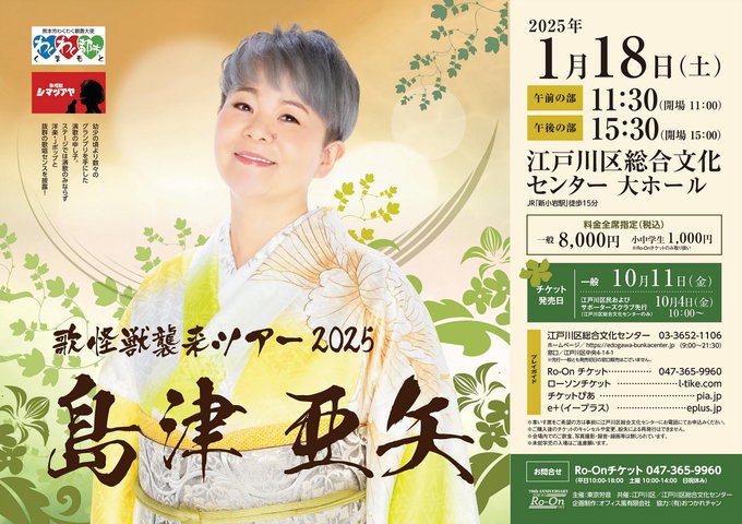 #島津亜矢 歌怪獣襲来ツアー2025 好評発売中! 幼少の頃より数々のグランプリを手にした演歌の申し子。 ステージでは演歌のみならず洋楽・Jポップと抜群の歌唱センスを披露します! 残席僅少のため、完売の際はご容赦ください https://edogawa-bunkacenter.jp/calendar/2025/01/057640.html…