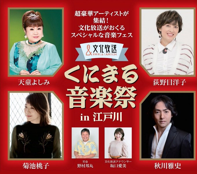 くにまる音楽祭 in 江戸川1/25(土) 天童よしみさんは、「大ちゃん数え歌」、「道頓堀人情」、「珍島物語」などヒットを飛ばし2022年にはデビュー50周年を迎えるなど幅広く活躍されています! #天童よしみ #荻野目洋子 #菊池桃子 #秋川雅史 #野村邦丸 #坂口愛美 https://edogawa-bunkacenter.jp/calendar/2025/01/057720.html…