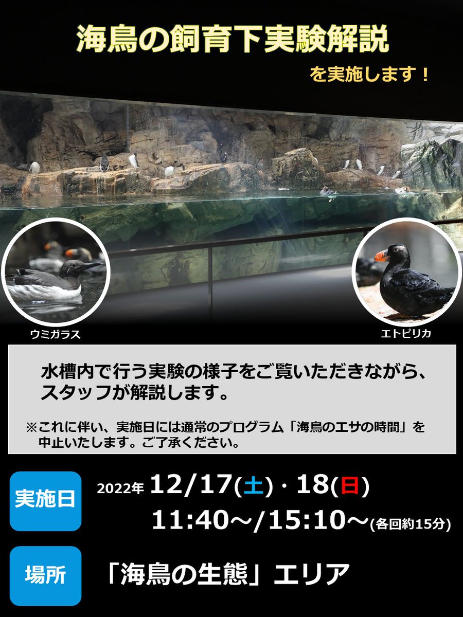 【海鳥スポットガイド開催】海鳥を取り巻く問題の中で、今回は混獲に着目。飼育下での実験を実際に観察しながら、スタッフが解説します。日時:12/17(土)・18(日) 各日11:40/15:10場所..