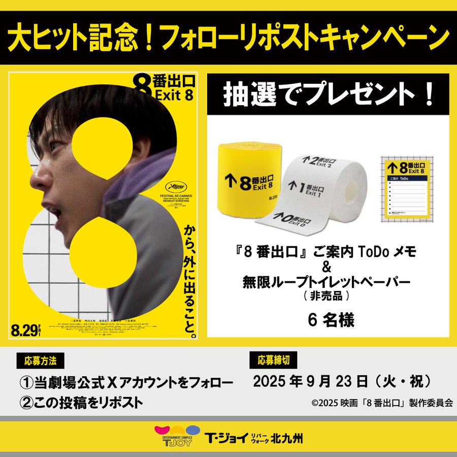 映画『#8番出口』大ヒット記念キャンペーン抽選で『8番出口』ご案内ToDoメモ&無限ループトイレットペーパー(非売品)セットを、6名様にプレゼント⋘応募⋙当劇場をフォローこの投稿をリポスト締切..