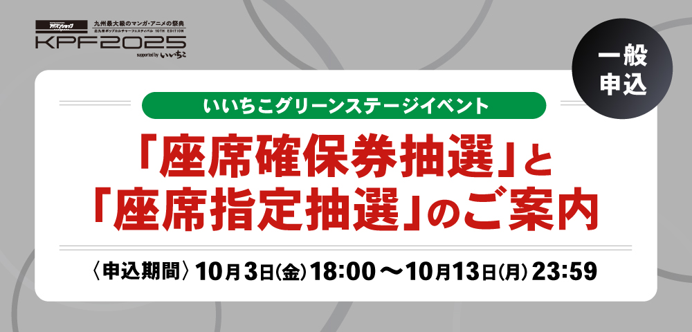 #KPF2025infoアパマンショップKPF2025supportedbyいいちこいいちこグリーンステージイベントの「座席確保券抽選」一般申込みのご案内を更新致しました。《一般申込》※対象:全てのお..