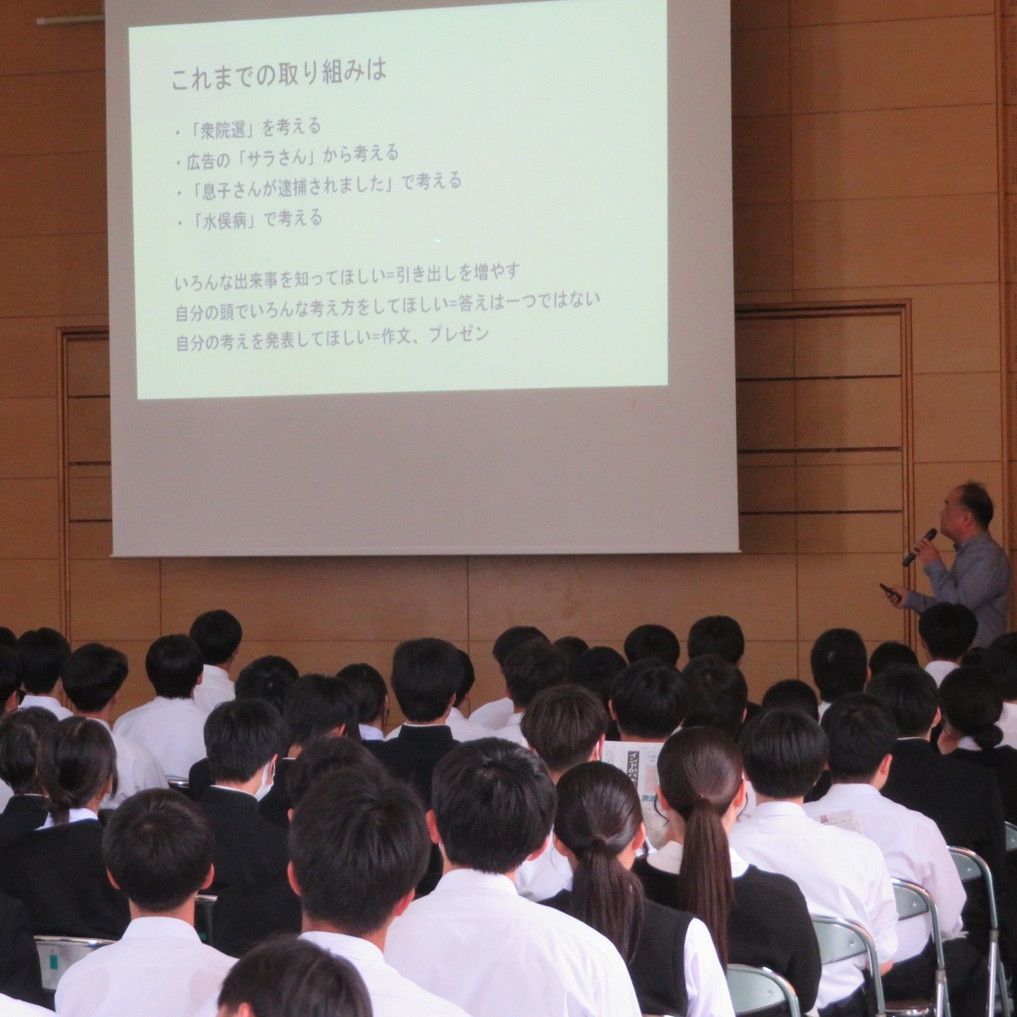 5月12日、朝日新聞連続講座2年第1回を開催しました。前半は「わたしのこだわり」(春休み課題)の評価と新聞記事の「パラパラ読み」、後半は「水俣現地研修会」(3/25)に参加した8名の報告が行わました。..