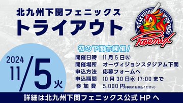 /#北九州下関フェニックス球団独自トライアウト開催\25年度シーズンに向けたトライアウトを11/5(火)に開催いたします。初の下関市開催ご応募お待ちしております締切:10/30(水)17:00まで詳細..