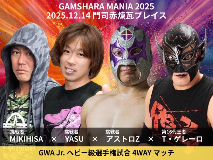 12.14GAMSHARAMANIA2025情報決定対戦カードGWAJr.ヘビー級選手権試合4WAYマッチ【挑戦者】MIKIHISAvs【挑戦者】YASUvs【挑戦者】アストロZvs【第16代王者】ト..
