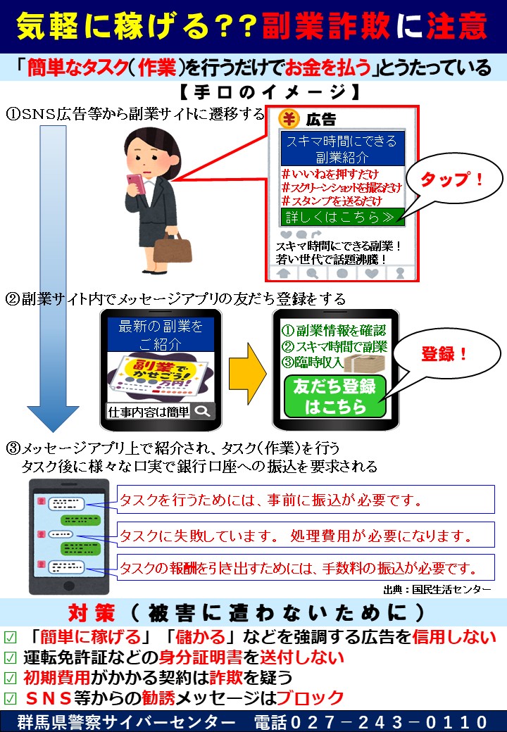 【気軽に稼げる??副業詐欺に注意】県内においてスキマ時間に気軽に稼げる等の副業詐欺の相談が増加していますお金を稼ぐはずが、お金を振り込まされます手口と対策はこちら