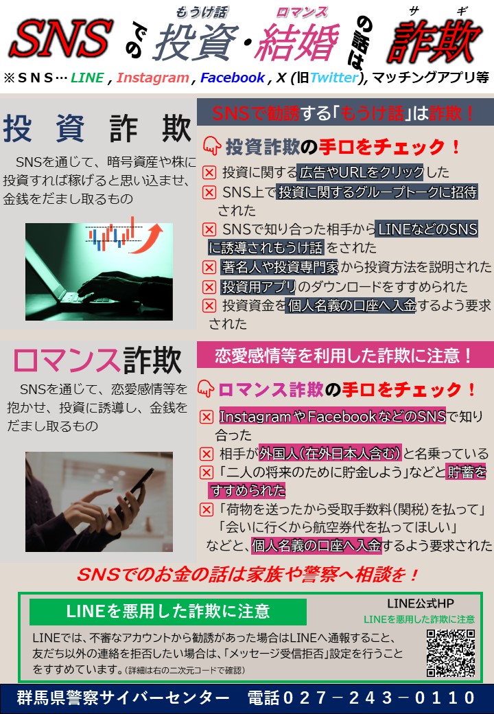 【SNSでの投資・結婚の話は詐欺】県内においてSNSを通じた投資詐欺・ロマンス詐欺の被害相談が増加しています家族や警察に相談手口のチェック項目はこちら