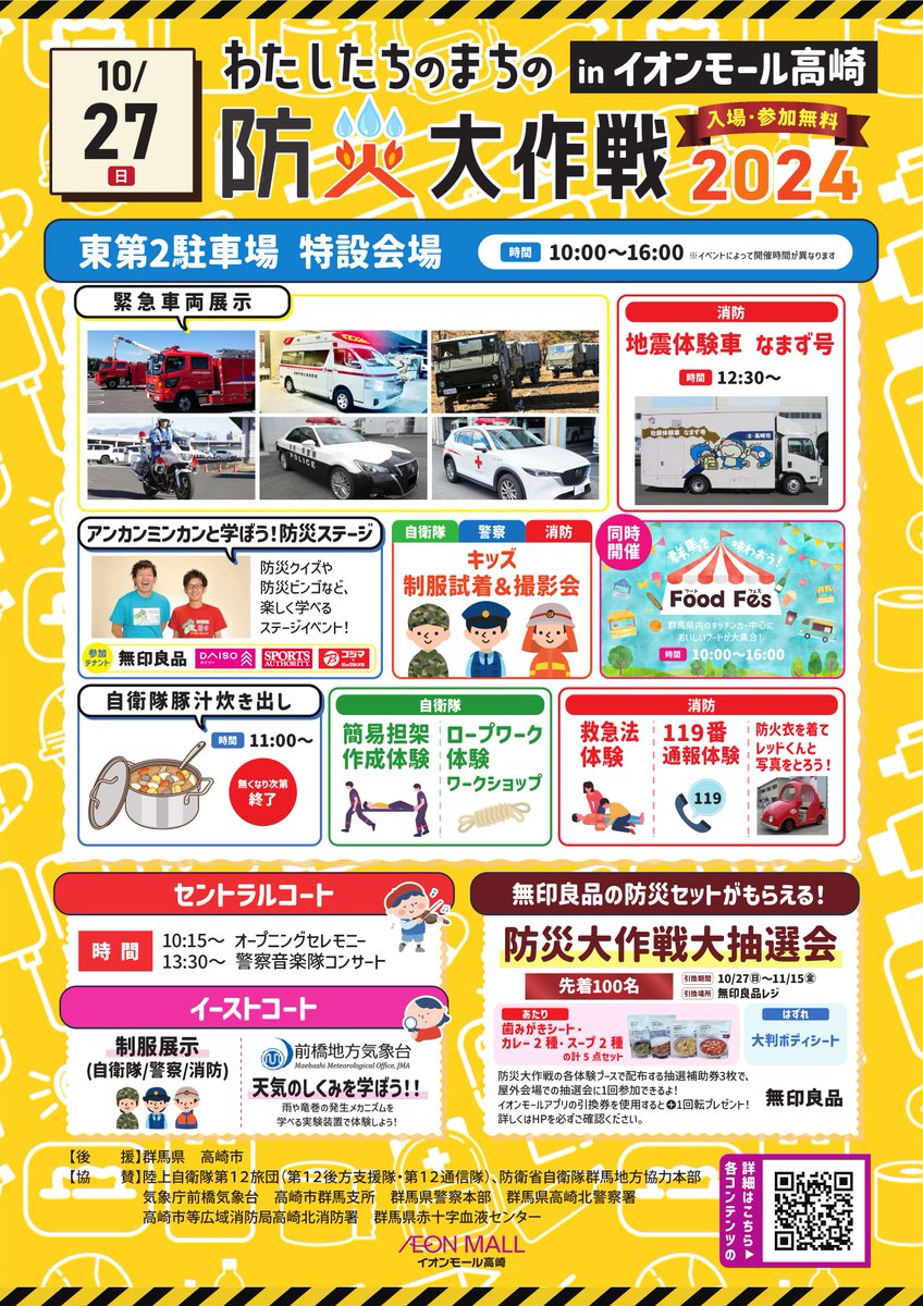 イオンモール高崎では、10月27日(日)に「わたしたちのまちの防災大作戦2024」を開催します。緊急車両の展示や地震の体験、防災ステージなど盛りだくさんな内容で、群馬県もブースを出展します。入場・参加..