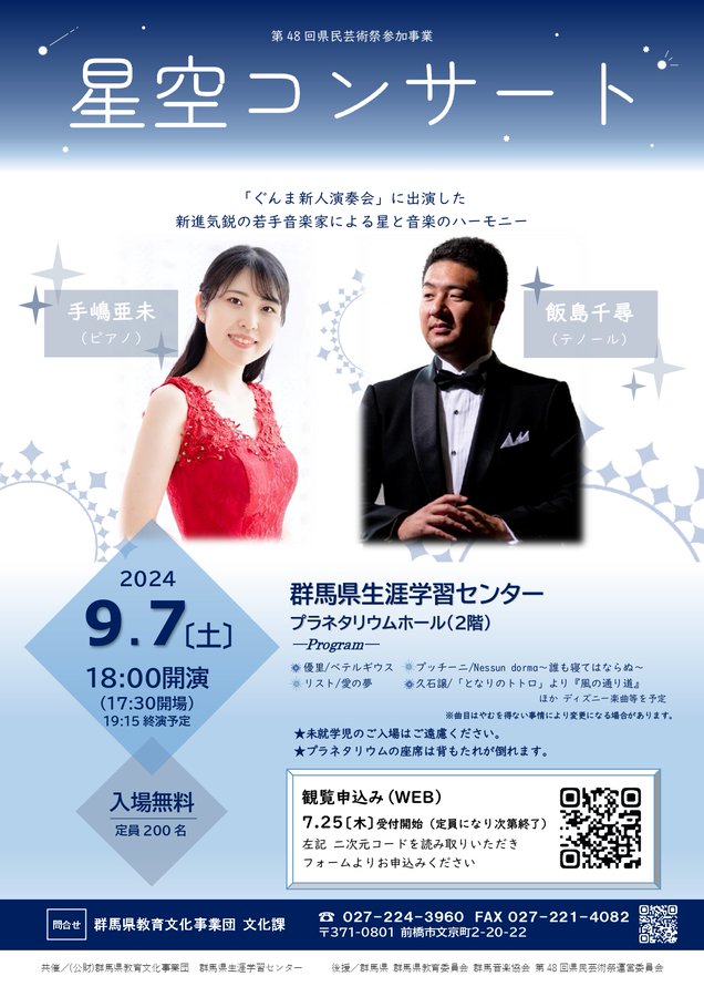 「星空コンサート」観覧受付中ぐんま新人演奏会出演の若手音楽家による星と音楽のハーモニー出演飯島千尋(テノール)手嶋亜未(ピアノ)2024年9月7日(土)18:00開演群馬県生涯学習センタープラネタリウ..