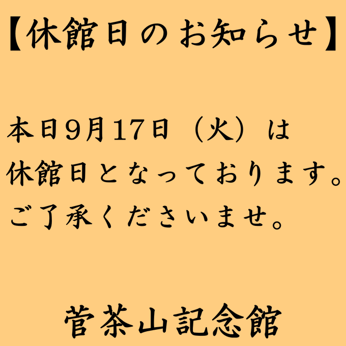 【休館日のお知らせ】本日9月17日(火)は先日9月16日(月・祝)の祝日開館による振替休館日となっております。ご来館をご予定の方はお気を付けくださいませ。#菅茶山記念館#福山市#神辺町#休館日